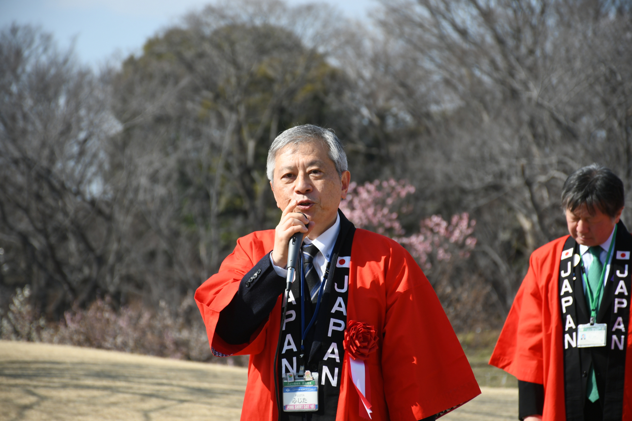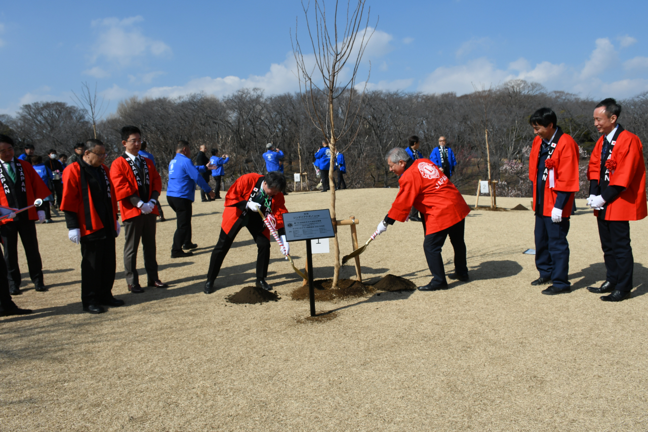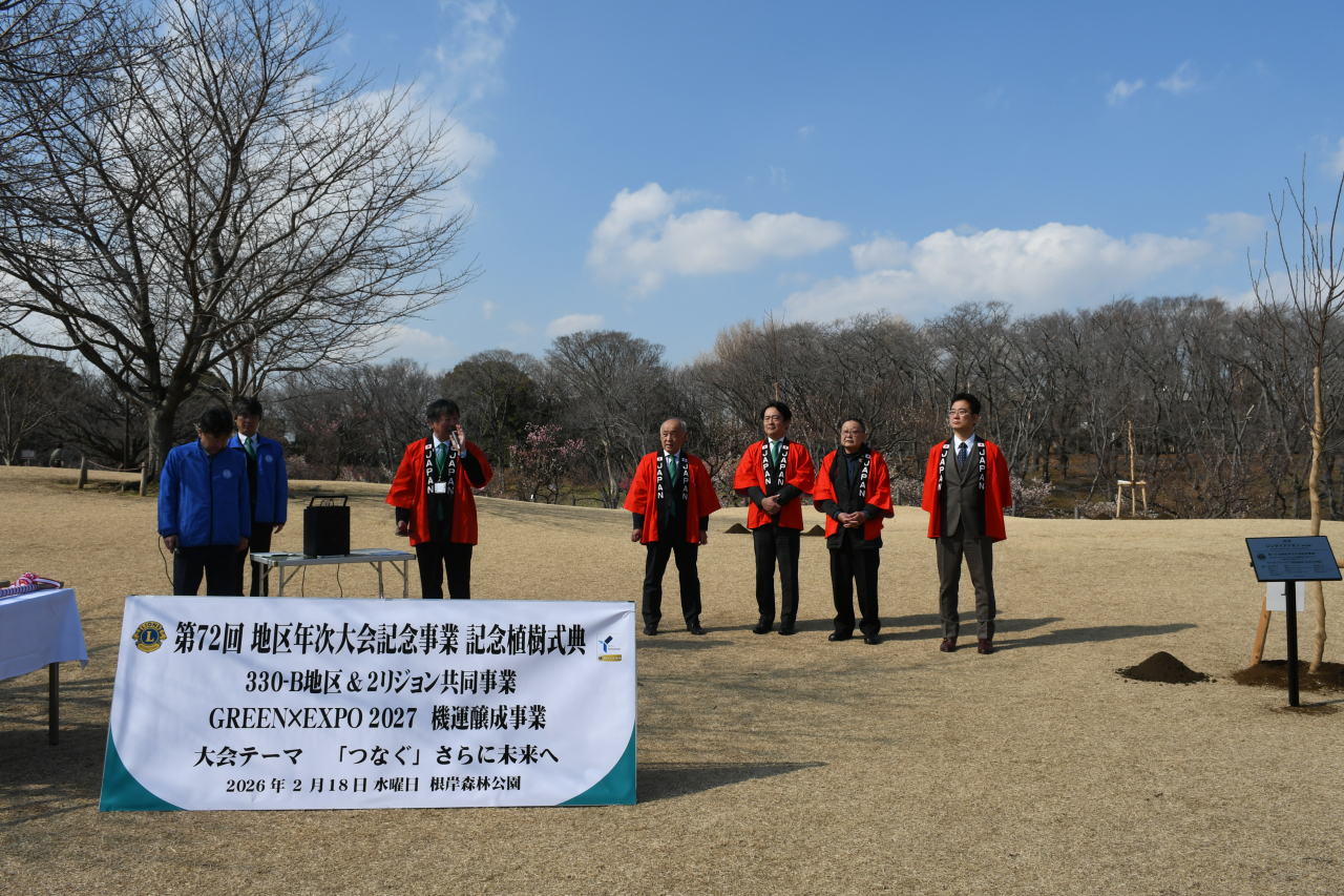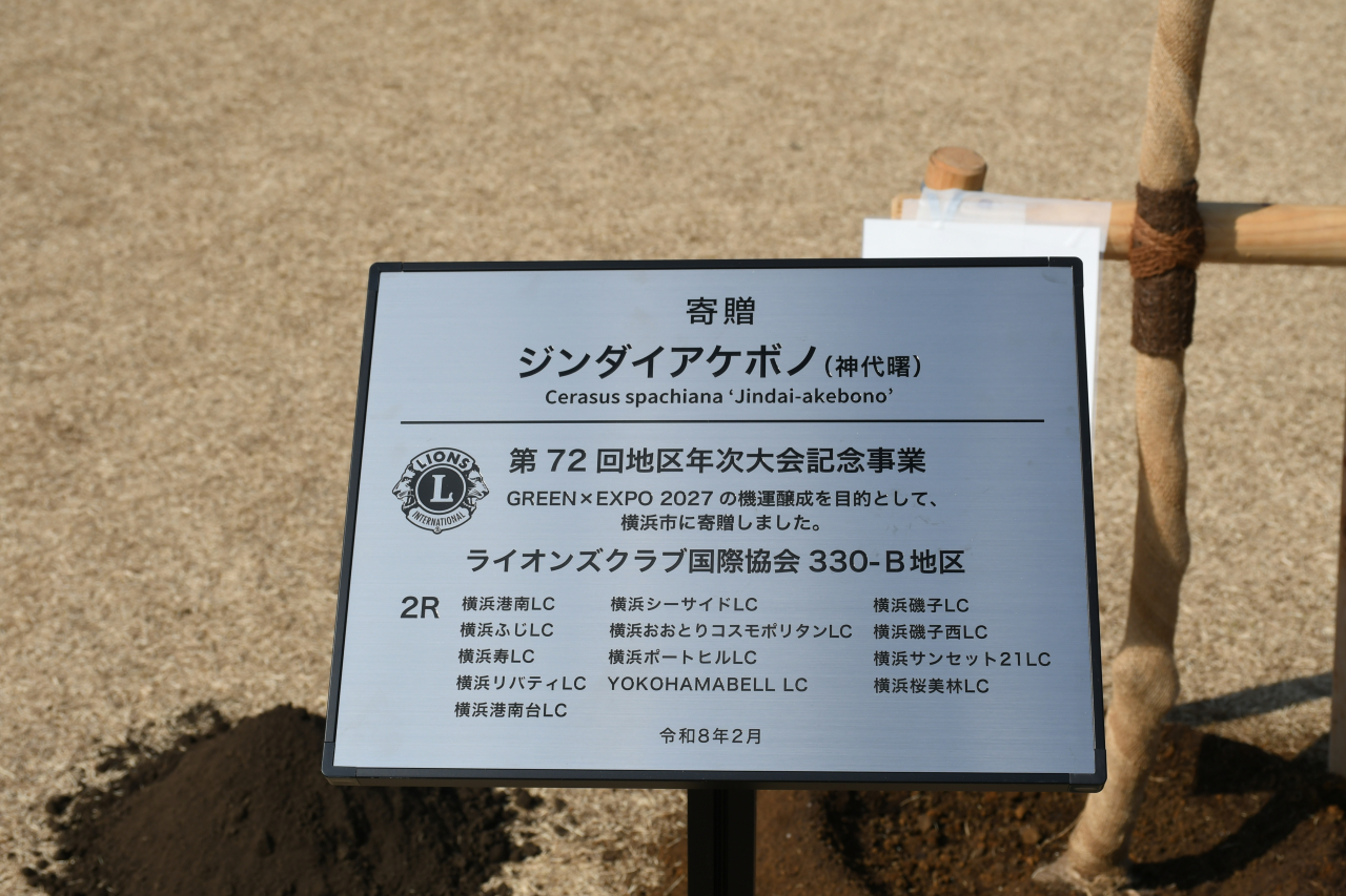 これは年次大会が4月に横浜市内で行われることを記念するのと同時に、来年3月に開幕する「GREEN×EXPO 2027」(国際園芸博覧会)へ向けた機運醸成を兼ねの企画で、植樹式にはLCメンバーのほか、市みどり環境局や国際園芸博覧会協会の関係者など約50人が参加。園内に高さ約3mのジンダイアケボノを植樹しました。